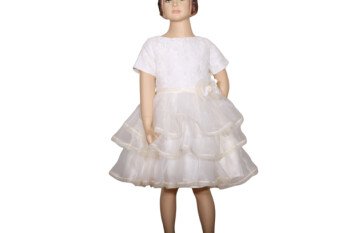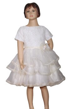 فستان راقي نوعيه قماش بروكار ابيض من الاعلى وشيفون على شكل مدرجات للاسفل يزينه من الوسط فيونكه بالون الابيض والوردي لتعطي تناسق للالوان بشكل رائع